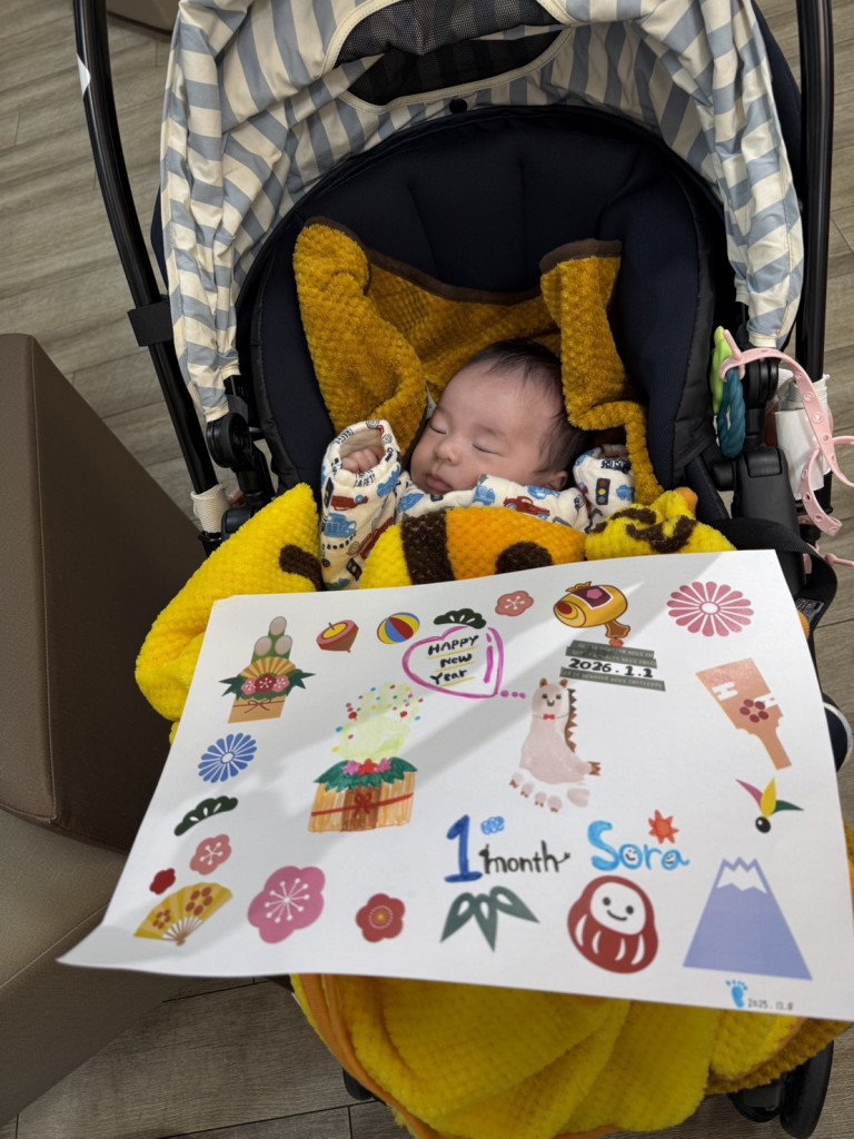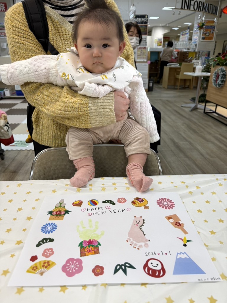 お正月をテーマにしたフレームで手形足形アートを作ってもらいました。